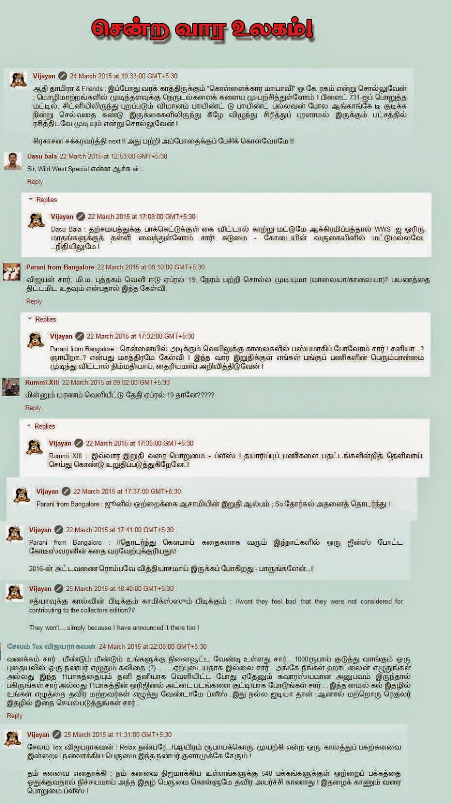 4. Sundar Raj : //டைகர்/டெக்ஸ் யுத்தம் சற்று ஓய்ந்ததுபோல் உள்ளது. இந்த இரண்டு இதழ்களும் ஒருசேர வந்தால் பழையபடி இந்த தளம் களைகட்ட ஆரம்பித்துவிடும் அதற்காகத்தான்//