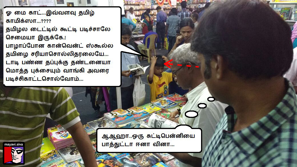 சென்னையில் வசிக்கும் ஒரு அழகான குடும்பம் அது ! கைக்குழந்தையோடு கணவரும், கர்ப்பிணி மனைவியும் மாத்திரமின்றி, அவரது பெற்றோர்களும் புத்தக விழாவிற்கு வருகை தந்திருந்தனர் ஞாயிறன்று ! கணவர் நமது தீவிர ரசிகர் போலும் ; ஆனால் சென்றாண்டில் ஏதோ காரணங்களால் சந்தாவும் செலுத்திடவில்லை ; நிறைய இதழ்களை வாங்கிடவும் செய்யவில்லை ! காமிக்ஸ் கொள்முதலுக்கென நிறையச் செலவிடுவதை மனைவி கண்டித்திருந்தாரோ என்னவோ - இம்முறை தாஜா செய்து நம் ஸ்டாலுக்கு அழைத்து வந்துவிட்டார் ! வந்த மனுஷன் - பட்டாசுக கடைக்குள் புகுந்த பாலகனைப் போல உற்சாகத்தில் துள்ளிக் குதிக்க ஆரம்பித்து விட்டார் ! பெற்றோர்கள் சிறுவயது முதலே அவரது காமிக்ஸ் ஆர்வத்தை ஊக்குவித்தவர்கள் என்பதாலோ, என்னவோ - அங்கிருந்த நாற்காலியில் ஓய்வாக அமர்ந்து விட்டு மகனின் ஆனந்த் தாண்டவத்தை ரசித்துக் கொண்டிருந்தனர் - "வேணும்னா வாங்கிக்கோப்பா !! " என்றபடிக்கே ! கணவரோ தன்னிலையில் இல்லை !! - "ஐயோ..என் பெயர் டைகர் இருக்கு !!" ; "அச்சச்சோ....மின்னும் மரணம் - அந்த பெரிய புக் சொன்னேனலே...அதை வாங்கப் போறேன் !!" ; "ப்ளீஸ்பா..இந்த வருஷம் சந்தா கட்டிடுறேனே ? ! " ; "ஹேய்ய்ய்..டெக்ஸ் வில்லர் "சர்வமும் நானே" வாங்கிக்கட்டுமா ?"...;"அந்த கார்ட்டூன் புக் பாரேன் - வாங்கணும் !!" என்று மனைவியிடம் விண்ணப்பங்களையும் , தாஜாப் படலங்களையும் , அடக்க இயலா ஆர்வத்தையும் ஒரு சேர சர்ர் சர்ரென்று பதிவு செய்து கொண்டிருந்தார் ! கணவரே கைக்குழந்தையாகி விட்டதைக் கண்டு - கண்டிக்கவும் மனதின்றி - "பார்த்து வாங்கிக்கோங்க" என்று சொல்லி விட்டு ஒதுங்கி நிற்க துணைவியார் முயற்சிக்க, நொடிக்கு நொடி - கணவரின் உற்சாகம் உச்சத்துக்குச் சென்று கொண்டிருந்தது ! "காமிக்ஸ் காதல்" ரொம்பவே வித்தியாசமானது மேடம்....உங்களை சங்கடப்படுத்தவும் அவருக்கு மனதில்லை ; இவற்றின் மீதான நேசத்தை உதறவும் முடியவில்லை அவருக்கு !" என்று நான் சொல்ல "புரிகிறது சார் !" என்று அனுசரணையாய் பதில் சொன்னார் " அதற்குள் "ஹை...தலையில்லாப் போராளி !!" ; " ஹை...ஈரோட்டில் இத்தாலி !!" " ஹை....என் பெயர் டைகர் black & white -லே " என்று நம்மவரின் குரல் உச்சத்துக்குச் சென்று கொண்டிருந்தது! அந்தக் குரலில் ஒலித்த கலப்படமில்லா உற்சாகம் உள்ளுக்குள் என்னை என்னவோ செய்தது ! எத்தனையோ சாமங்களில் விழித்திருந்து செய்த வேலைகளின் பளுவோ, பாரமோ சார்ந்த நினைவுகள் அந்த ஒற்றை நொடியில் கரைந்தே போய் விட்டது போல் உணர்ந்தேன் ! ஒரேயொரு முகத்தில் இந்தப் புன்னகையைக் கொணர்வது சாத்தியமாகின் கூட அதன் பொருட்டு ஓராண்டின் முழுமைக்கும் கண்முழித்திருப்பதில் தப்பில்லை என்று அந்த நொடியில் தோன்றியது !! இந்த ஒன்றரை நாட்களில் நான் ஒட்டு மொத்தமாய்த் தரிசித்த